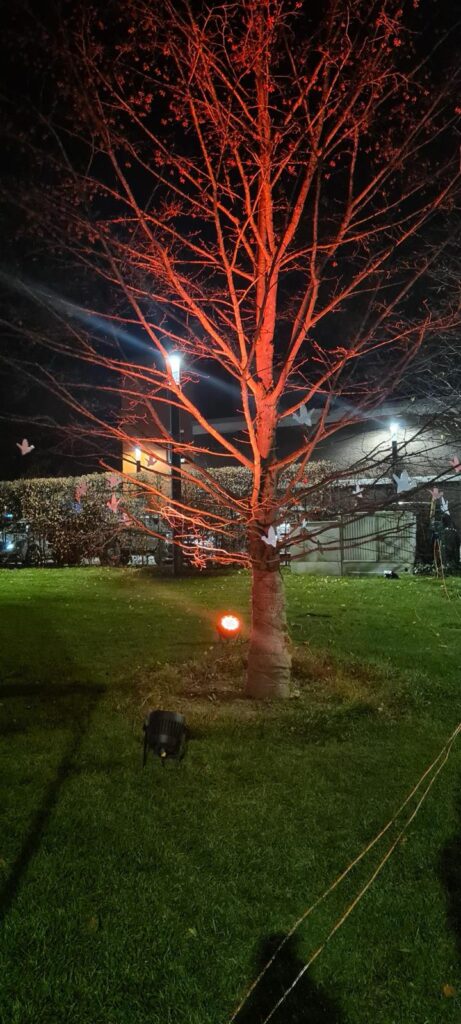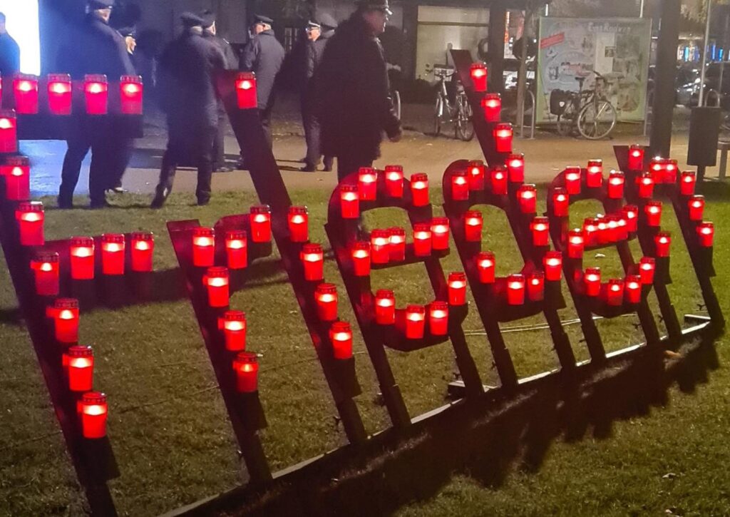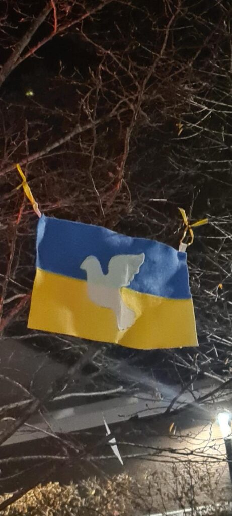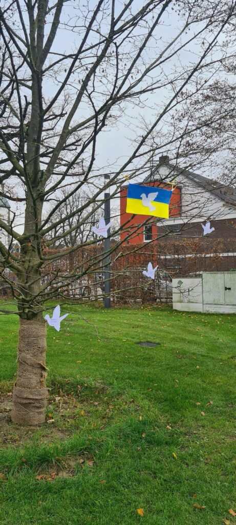 KrollbachschülerInnen der Klassen 9 hängen in der Gedenkfeier zum Volkstrauertag [15.11.25] Friedenstauben auf. Luba, geflüchtet aus der Ukraine berichtet über bewegende Momente im Krieg. Wie kann man Frieden bewahren? Wir brauchen Sicherheit, Verständnis, Respekt. Freundlichkeit und gute Gespräche.
